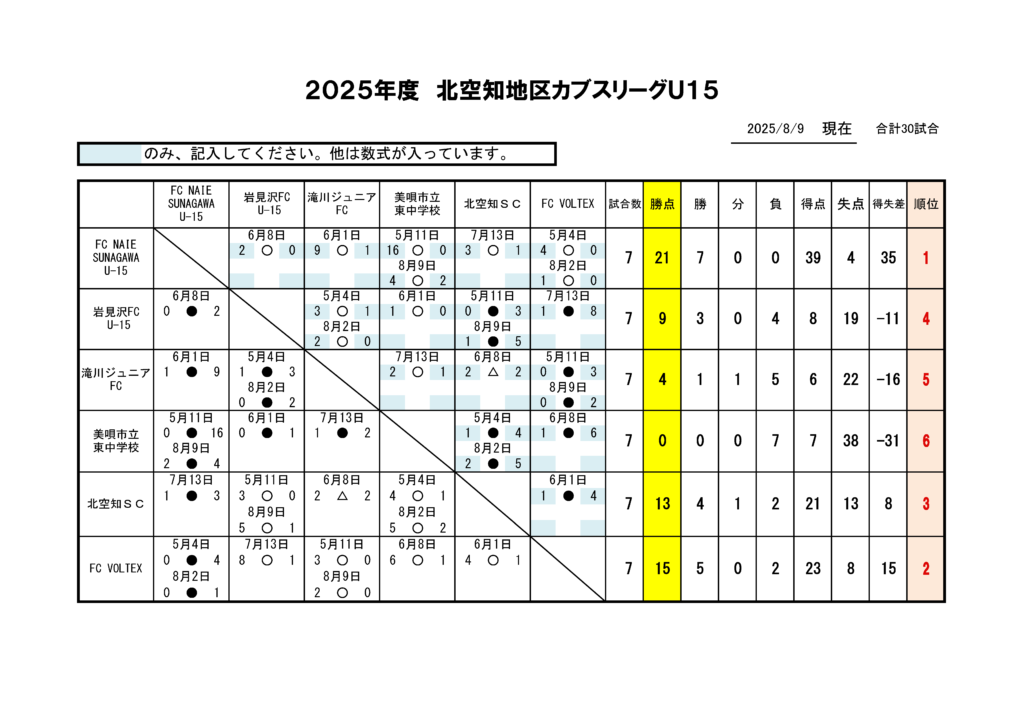 【結果】2025年 北空知地区カブスリーグ(第7節) 2025/08/10 ___ 2025 北空知カブスU15結果0809(PDFファイル) 関連記事 - Related Posts - 【結果】U14北空知新春フットサル大会 【結果】2023年 北空知地区カブスリーグ(6月25日分) 【結果】2023年 北空知地区カブスリーグ(6月18日分) 【結果】2023年 北空知地区カブスリーグ(7月16日分) 最新記事 - New Posts - 北海道サッカー協会健康チェックシート 【結果】U14北空知新春フットサル大会 フットサル審判講習会のお知らせ 【結果】11月29日(土)U9・U11北空知フットサル大会 結果 【結果】11月23日(日)U12 北空知フットサル大会 結果