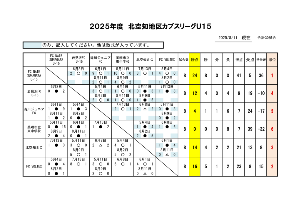 【結果】2025年 北空知地区カブスリーグ(第8節) 2025/08/12 2025 北空知カブスU15結果0811(PDFファイル) 関連記事 - Related Posts - 【結果】2023年 北空知地区カブスリーグ(6月18日分) 【結果】2024年 北空知地区カブスリーグ(第5節) 【要項、日程】2024年 U15フットサル選手権大会 北空知予選 【結果】U14北空知新春フットサル大会 最新記事 - New Posts - 北海道サッカー協会健康チェックシート 【結果】U14北空知新春フットサル大会 フットサル審判講習会のお知らせ 【結果】11月29日(土)U9・U11北空知フットサル大会 結果 【結果】11月23日(日)U12 北空知フットサル大会 結果