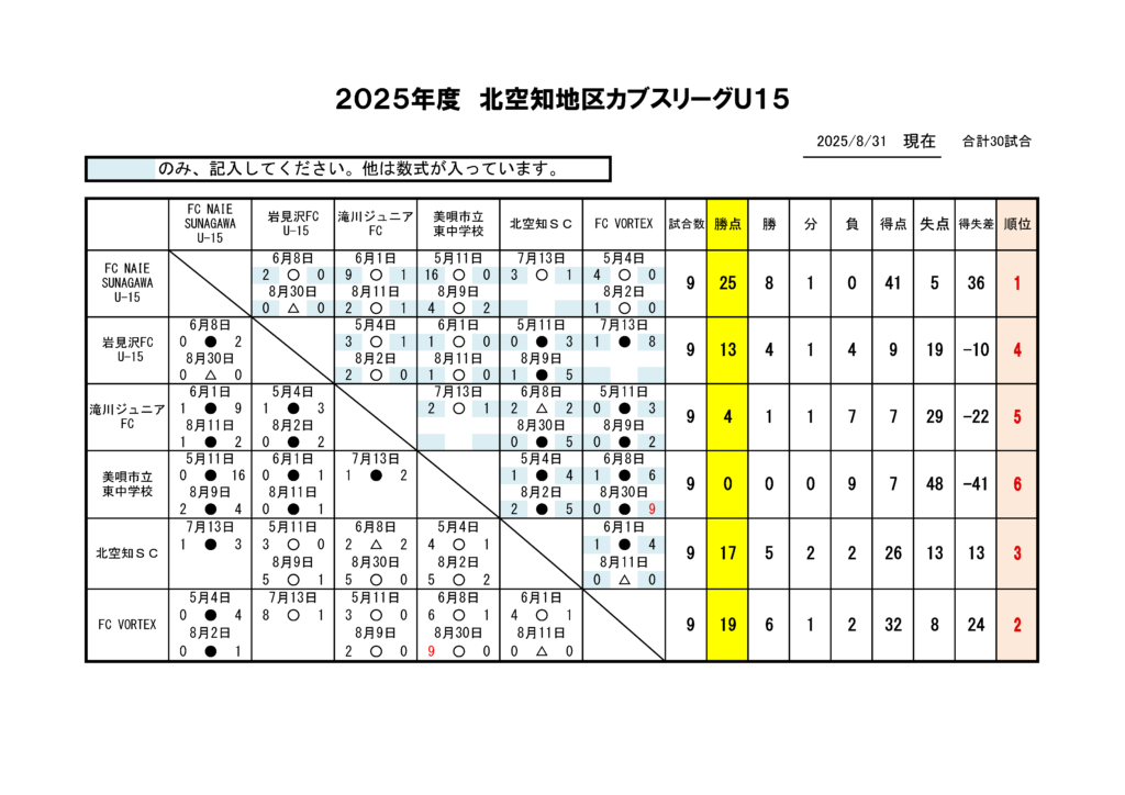 【結果】2025年 北空知地区カブスリーグ(第9節) 2025/08/31 2025 北空知カブスU15結果0830訂正(PDFファイル) 関連記事 - Related Posts - 【結果】2023年 U15フットサル選手権大会 北空知予選 【結果】2025年 北空知地区カブスリーグ(第7節) 【結果】2023年 北空知地区カブスリーグ(最終節) 【結果】2024年 北空知地区カブスリーグ(第2節) 最新記事 - New Posts - 北海道サッカー協会健康チェックシート 【結果】U14北空知新春フットサル大会 フットサル審判講習会のお知らせ 【結果】11月29日(土)U9・U11北空知フットサル大会 結果 【結果】11月23日(日)U12 北空知フットサル大会 結果