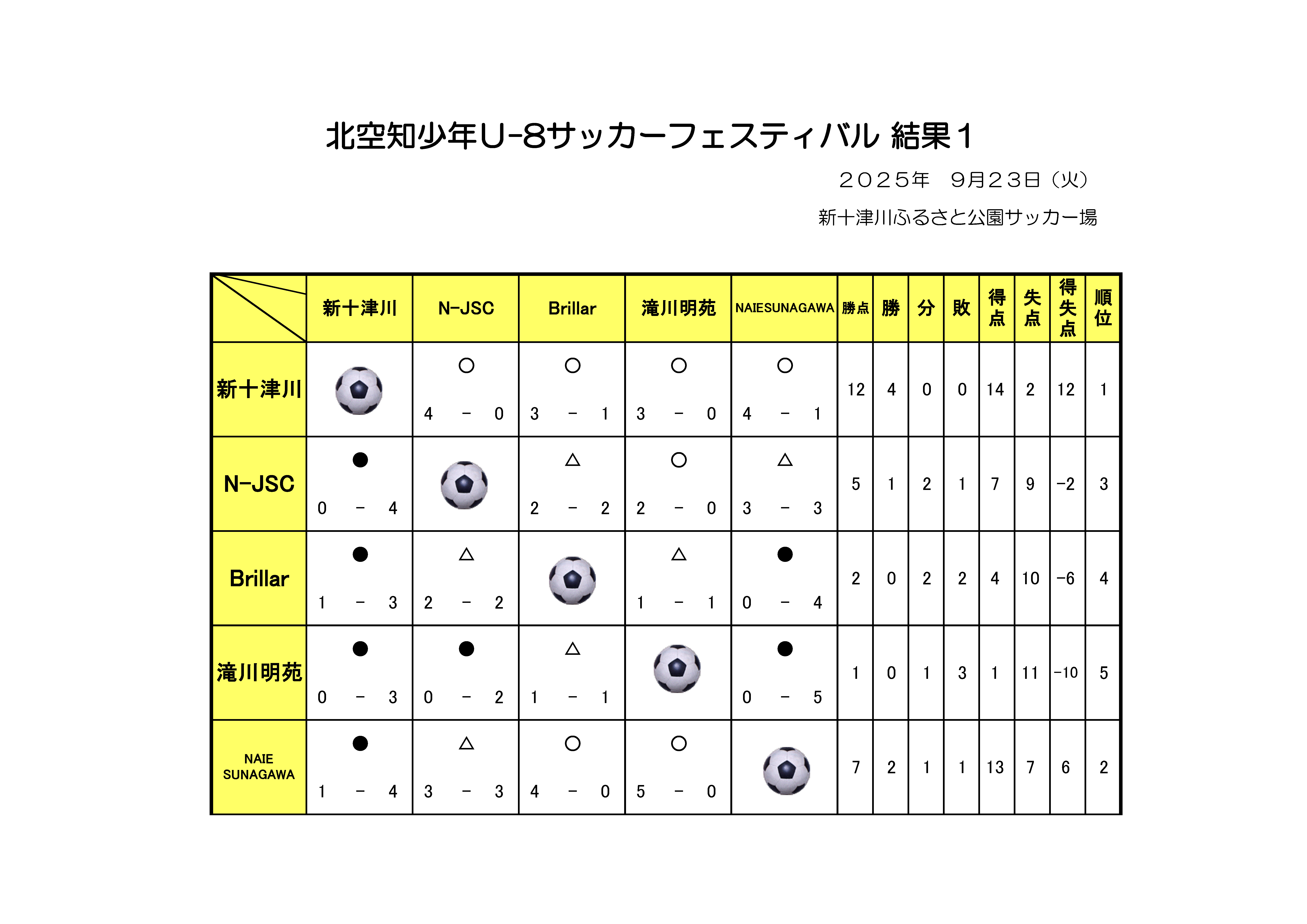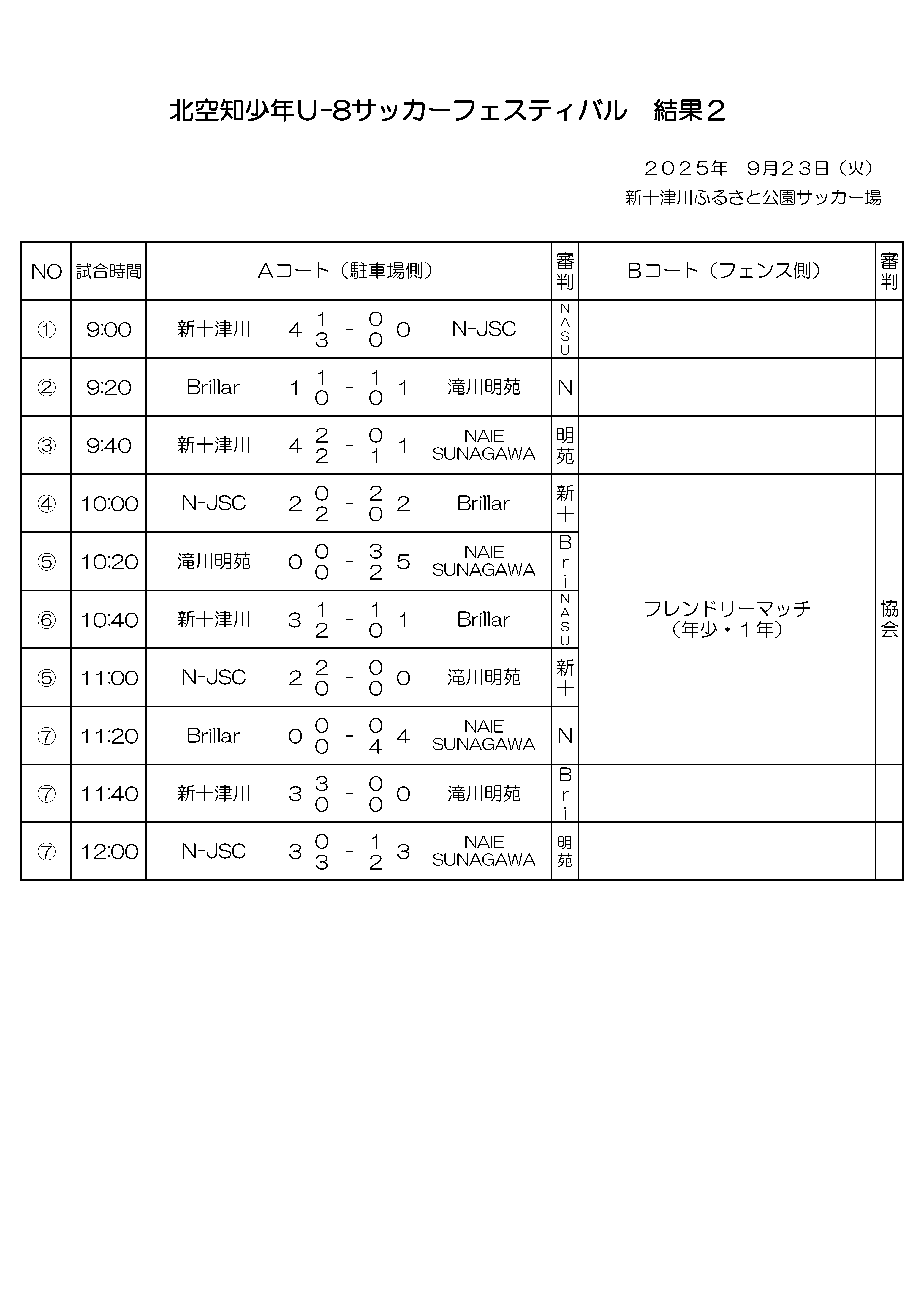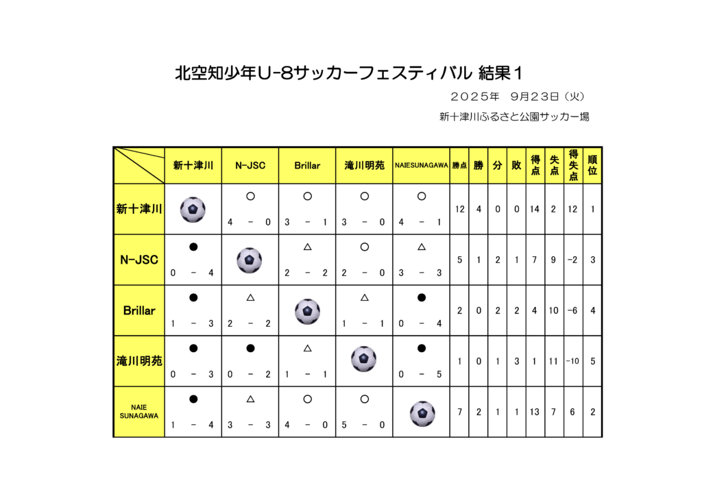 【結果】9月23日(火):U8北空知サッカーフェスティバル 結果 2025/09/24 25 U-8大会 結果(PDFファイル) 関連記事 - Related Posts - トラック協会杯第31回全道少年団(U-11)サッカー大会北空知地区予選 組合せ 【結果】2020北空知U-12リーグ第2~4節 【結果】トラック協会杯全道U-11サッカー大会北空知予選 【結果】2021年度全道少年8人制サッカー大会 兼 第18回JA全農杯全国小学生選抜サッカーIN北海道北空知地区予選 最新記事 - New Posts - 北海道サッカー協会健康チェックシート 【結果】U14北空知新春フットサル大会 フットサル審判講習会のお知らせ 【結果】11月29日(土)U9・U11北空知フットサル大会 結果 【結果】11月23日(日)U12 北空知フットサル大会 結果